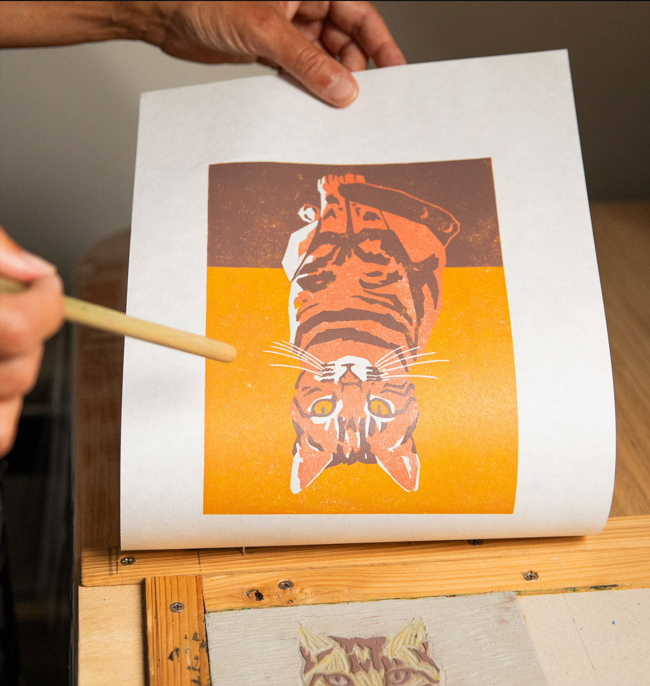 Vaak maak ik de printen met de zogenaamde reductie-techniek. Hierbij snij ik steeds meer weg van de linosnede, waardoor hij, nadat de prints klaar zijn, onbruikbaar is gemaakt. Ik kies dus van te voren voor een oplage en kan dan achteraf, ook al is de print populair, niet meer bijdrukken. Graag gebruik ik meerdere kleuren en een kleurige achtergrond. En als het maar even kan, verwerk ik roze in de portretten. Want ik word blij van roze!