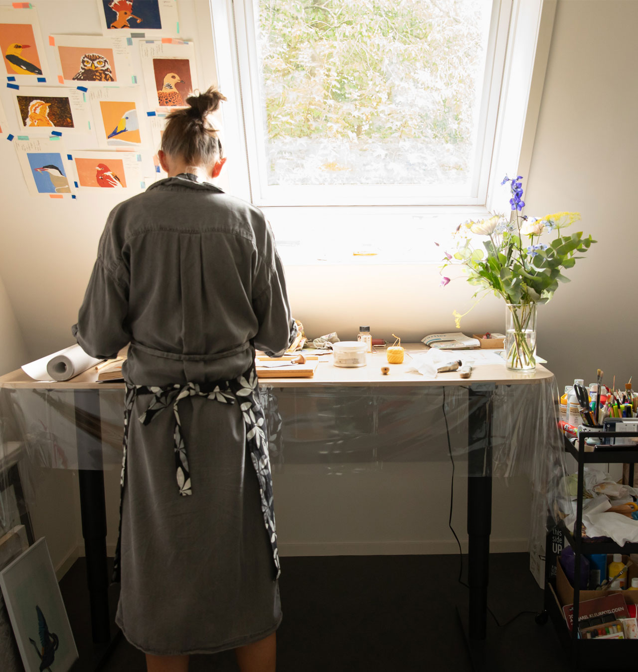 Op ambachtelijke wijze maak ik, met behulp van linosnede, portretten van dieren. Kleurrijk, onschuldig, eerlijk. In mijn manier van werken probeer ik rekening te houden met de kwetsbaarheid van de natuur.