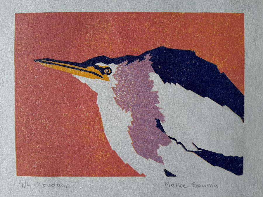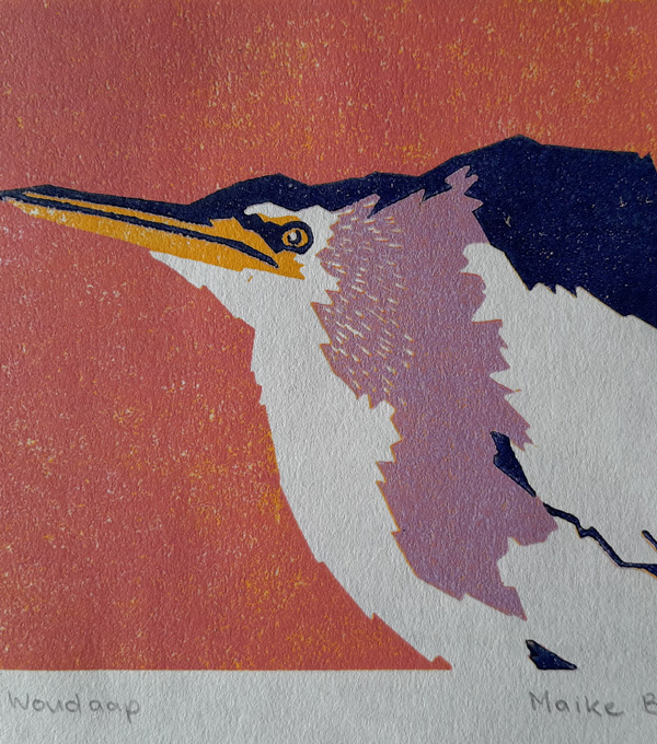 Deze print is gemaakt in het kader van een project over vogels op de Rode lijst van de vogelbescherming. De woudaap is een reigersoort van slechts zo’n 30 centimeter groot. In Nederland broeden elk jaar nog 10 tot 20 broedparen.